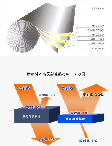 遮熱材高反射遮熱材は輻射熱を99%カットします (カタログ値)。さらに吸収された残りの1%は、内蔵のバブルポリエチレンの断熱層が熱の伝導を防止します。